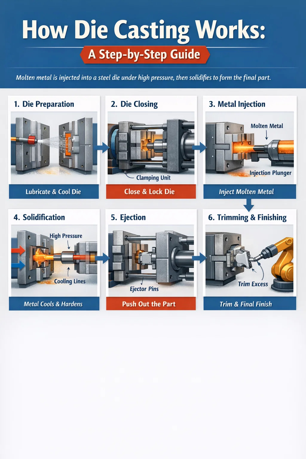Чтобы понять, как осуществляется литье под давлением, необходимо пройти каждый этап производственного цикла. Несмотря на то, что разные машины и сплавы имеют различия, основная последовательность действий одинакова во всей отрасли.