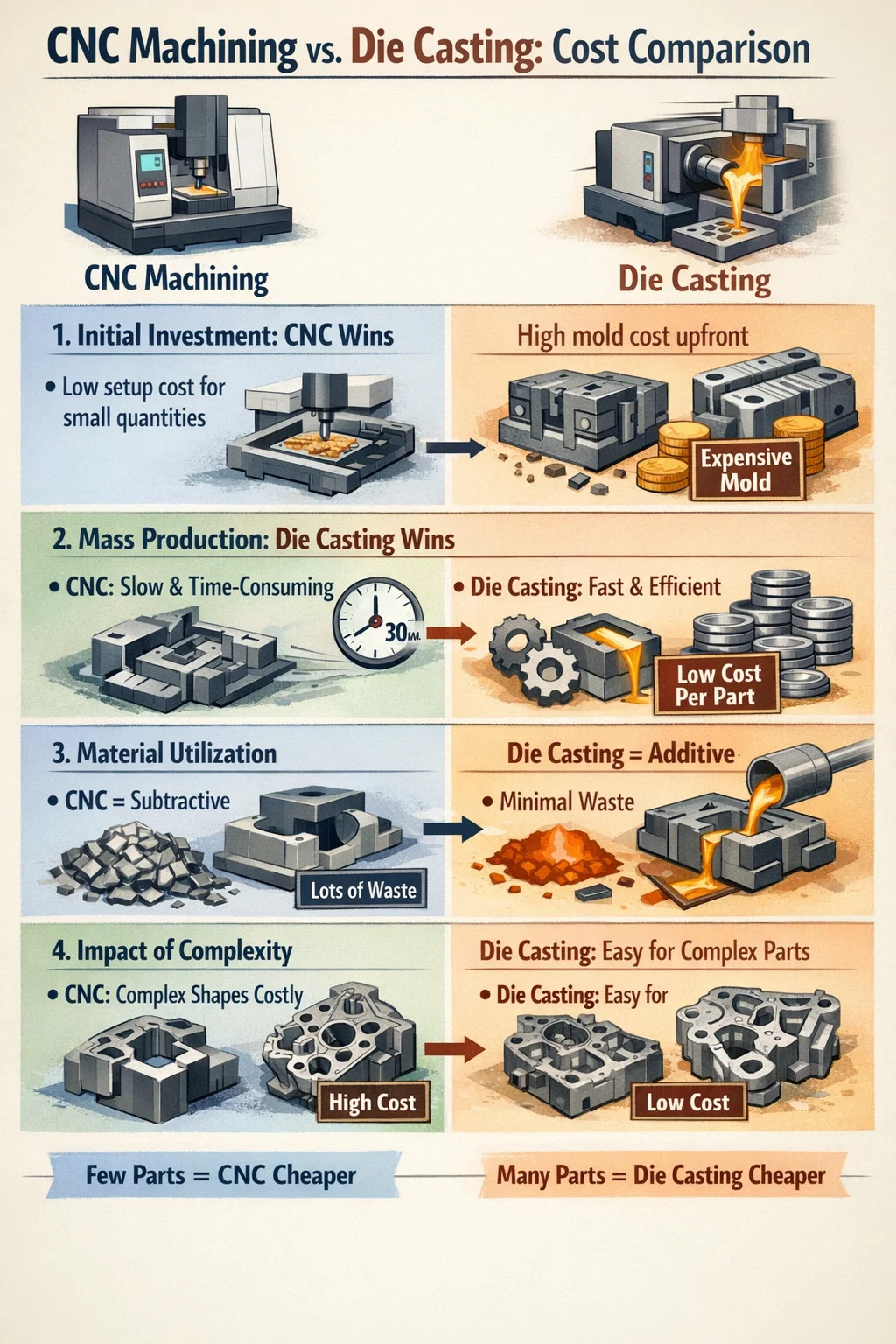 Скорость определяет стоимость: литье под давлением может «изготовить» деталь за секунды, а на станке с ЧПУ может потребоваться полчаса кропотливой работы. Время — деньги, и в крупномасштабном производстве эффективность литья под давлением может снизить себестоимость единицы продукции до очень низкого уровня.