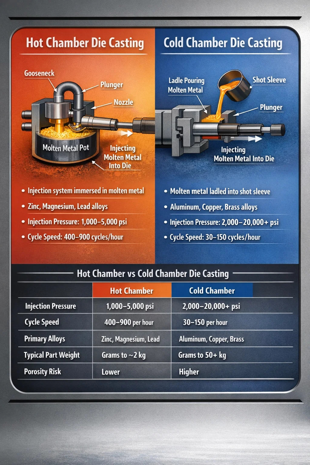 Два основных метода литья под давлением: литье под давлением с горячей камерой и литье под давлением в холодной камере . Эти два процесса преследуют одну и ту же фундаментальную цель — нагнетание расплавленного металла в закаленную стальную матрицу под высоким давлением для изготовления точных, повторяемых деталей — но они существенно различаются в том, как металл плавится, обрабатывается и впрыскивается. Выбор неправильного метода для вашего сплава или геометрии детали может привести к плохому заполнению, чрезмерной пористости, преждевременному износу матрицы и дорогостоящему браку. Понимание того, что отличает эти два метода, является отправной точкой для любого серьезного решения о литье под давлением.