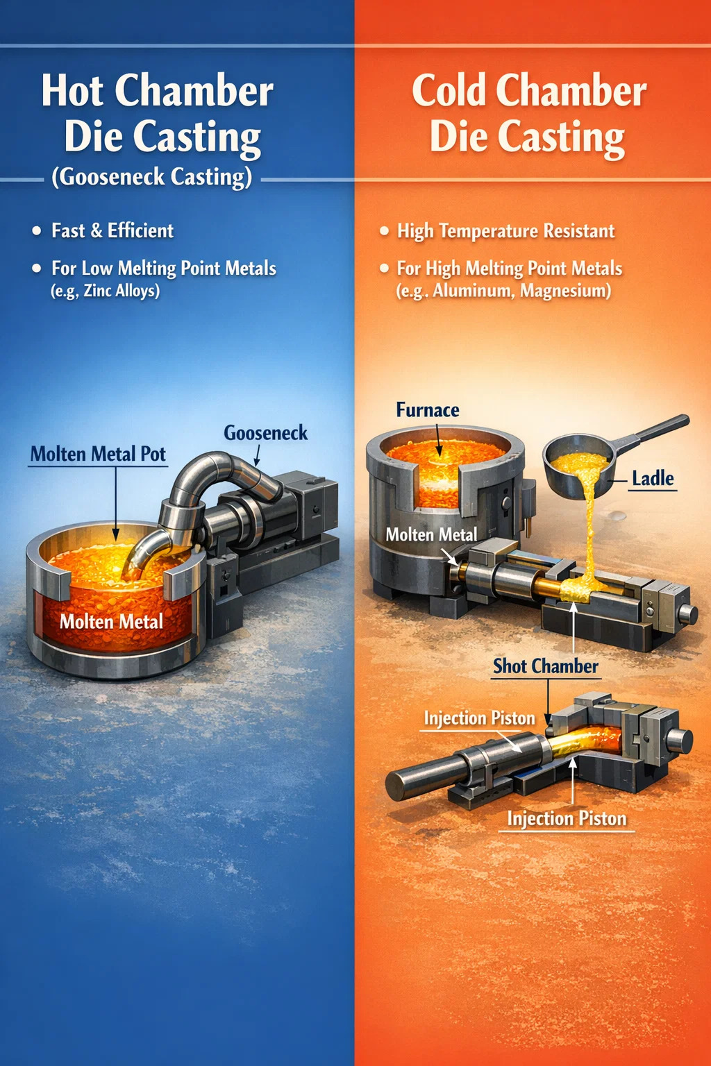 В мире литье под давлением Существует две основные категории в зависимости от того, как металл плавится и впрыскивается в форму: литье под давлением с горячей камерой и литье под давлением с холодной камерой.
